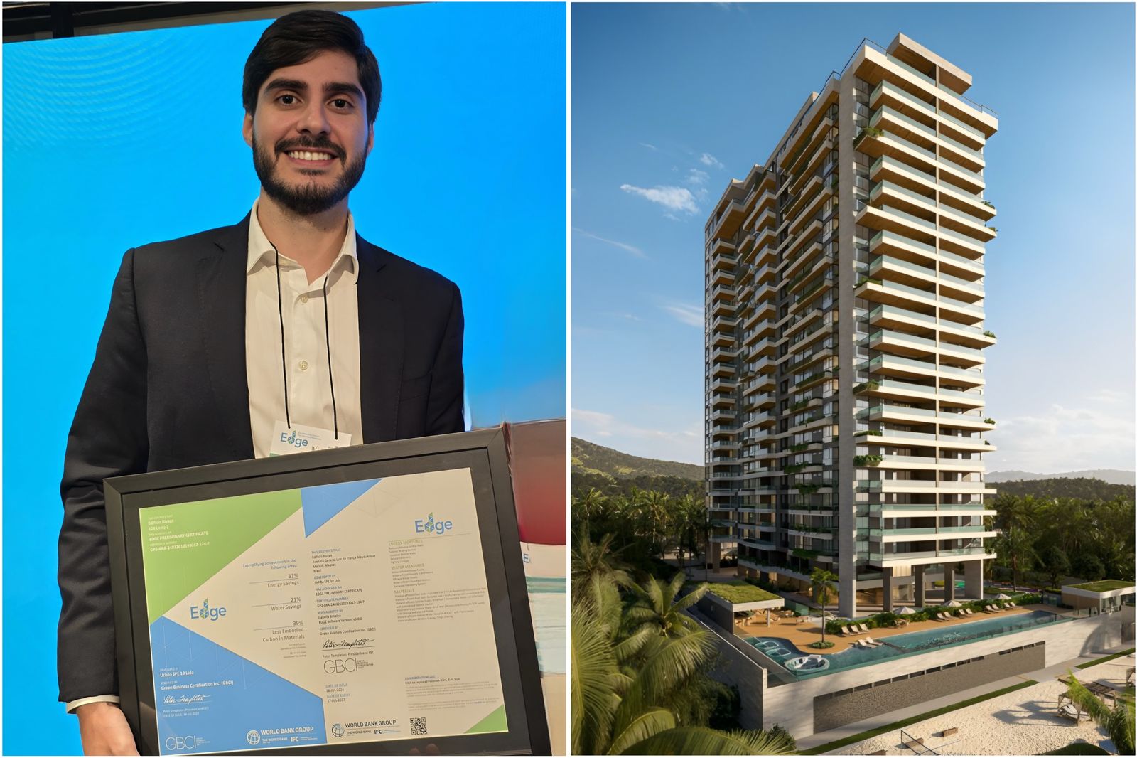 Rodrigo Uchôa com selo Edge do IFC, em São Paulo, pelo edifício Rivage: primeiro empreendimento de AL a receber certificação